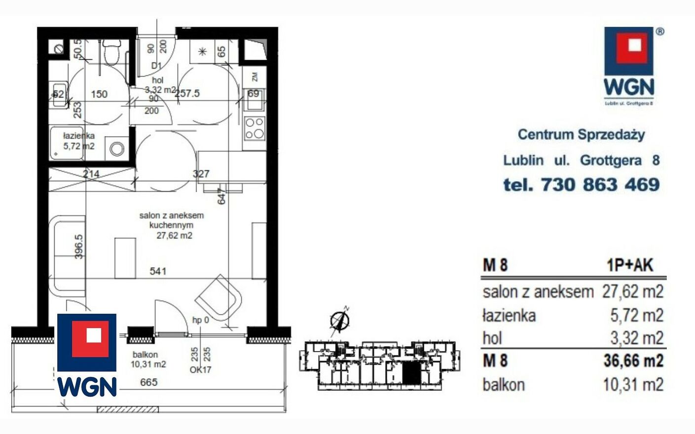 - 1 pokój z aneksem kuchennym (salon +ak 27,62m2, łazienka 5,82m2)