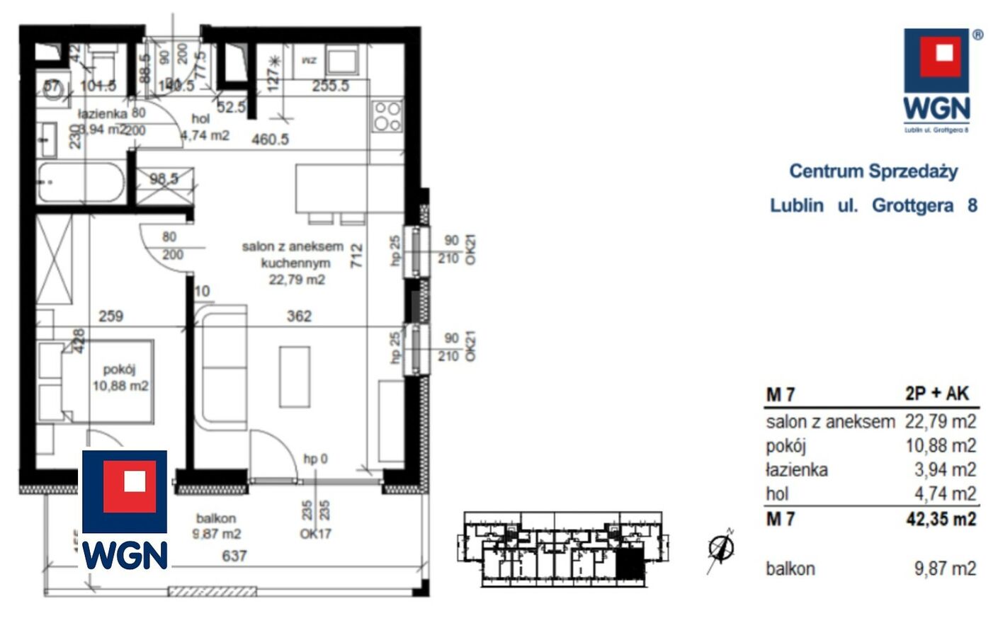 - 2 pokoje z aneksem kuchennym (salon + AK 22,79 m2, sypialnia 10,88 m2, łazienka 3,94 m2)